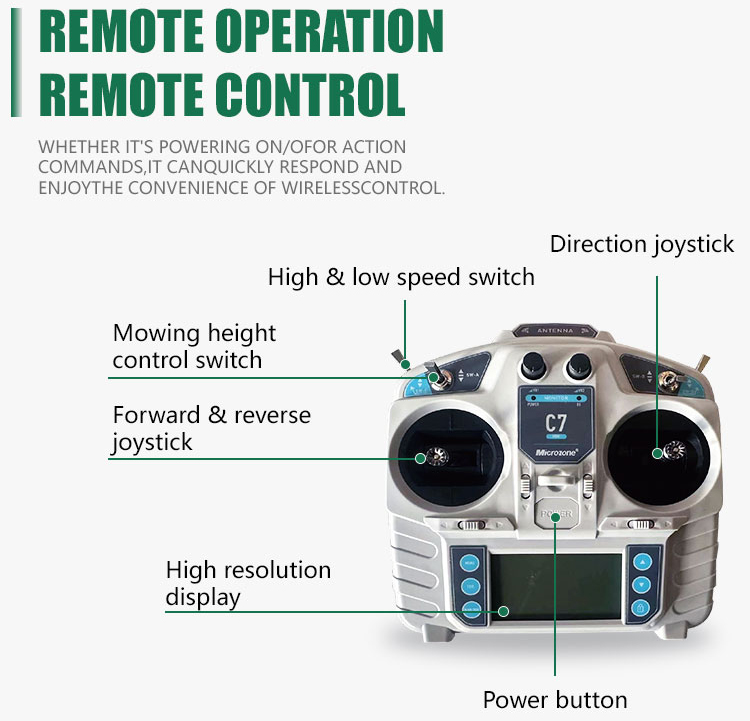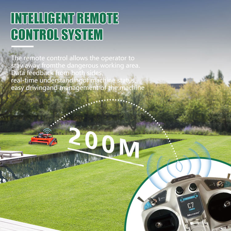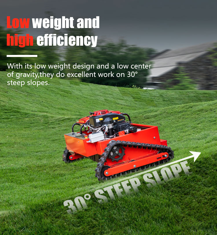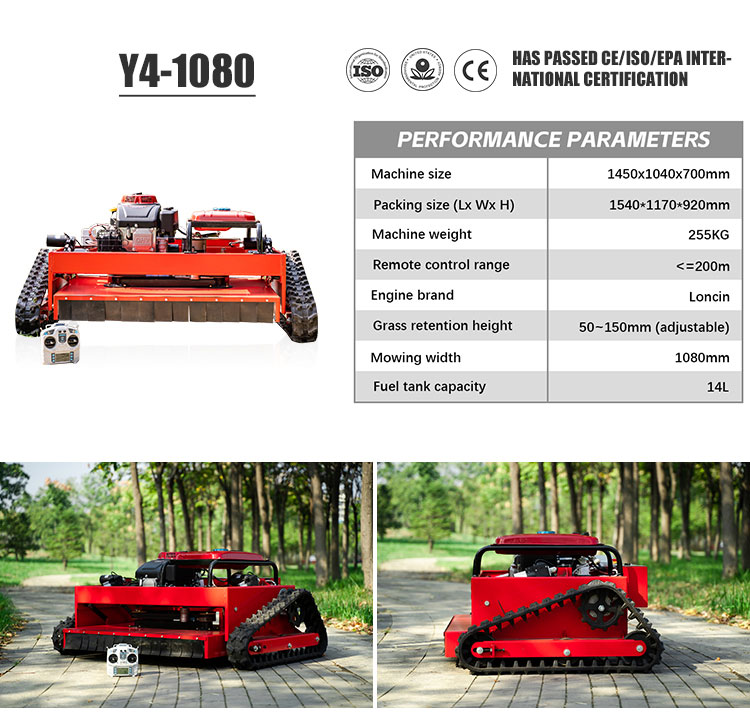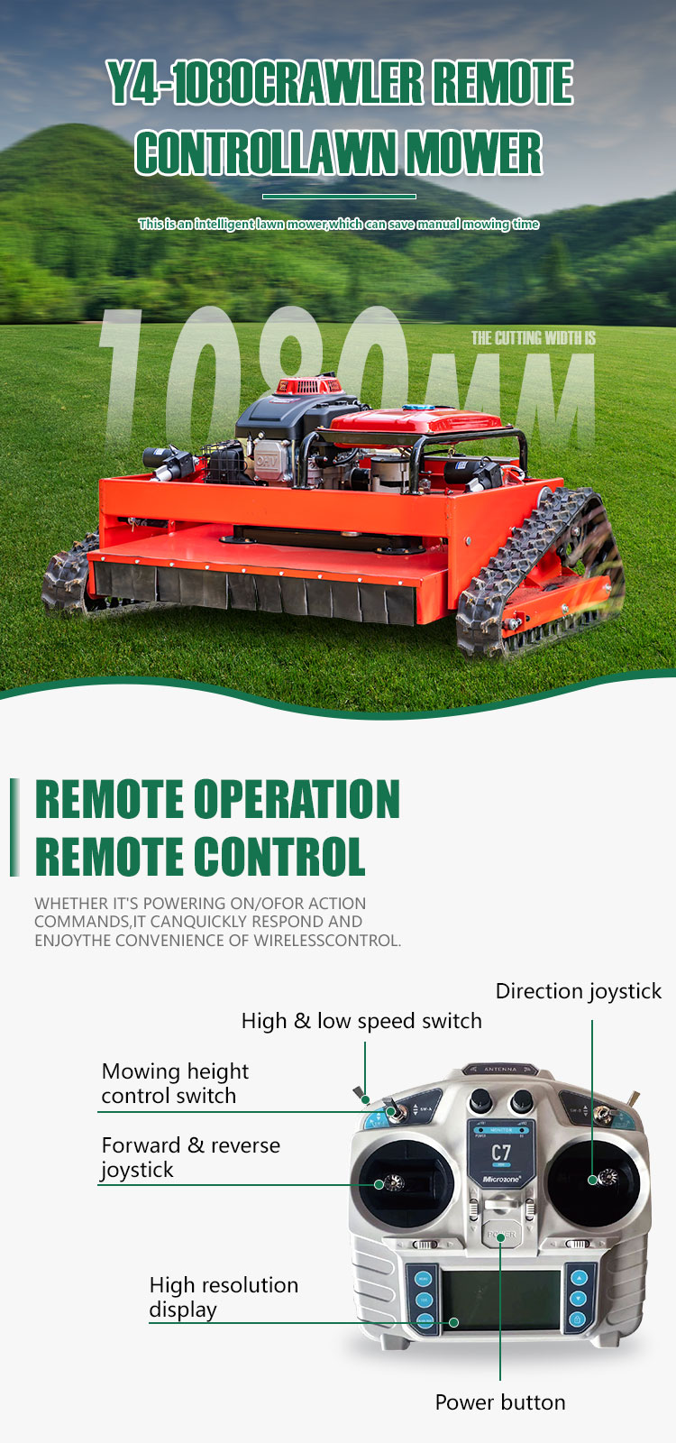 The Y4-1080 Wide Track Remote Control Lawn Mower is a heavy-duty, high-efficiency mowing solution designed for demanding commercial and large-scale landscaping applications. With an extra-wide 1080mm cutting deck, it delivers superior coverage and a remarkable working efficiency of 3000m² per hour, significantly reducing mowing time for expansive areas.Powered by a robust 16HP engine, this mower ensures reliable performance even in tough conditions. Its wide-track design (1450×1040×700mm) and substantial weight (253kg) provide exceptional stability and traction, making it ideal for uneven or sloped terrain with a 30° climbing capability.Operating at a steady 4km/h travel speed, the Y4-1080 balances precision and productivity, while the remote-control system enhances safety and convenience by allowing operators to maneuver the machine from a distance. Perfect for golf courses, municipal parks, and large estates, this mower combines power, durability, and advanced control for professional-grade results