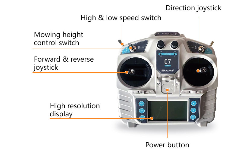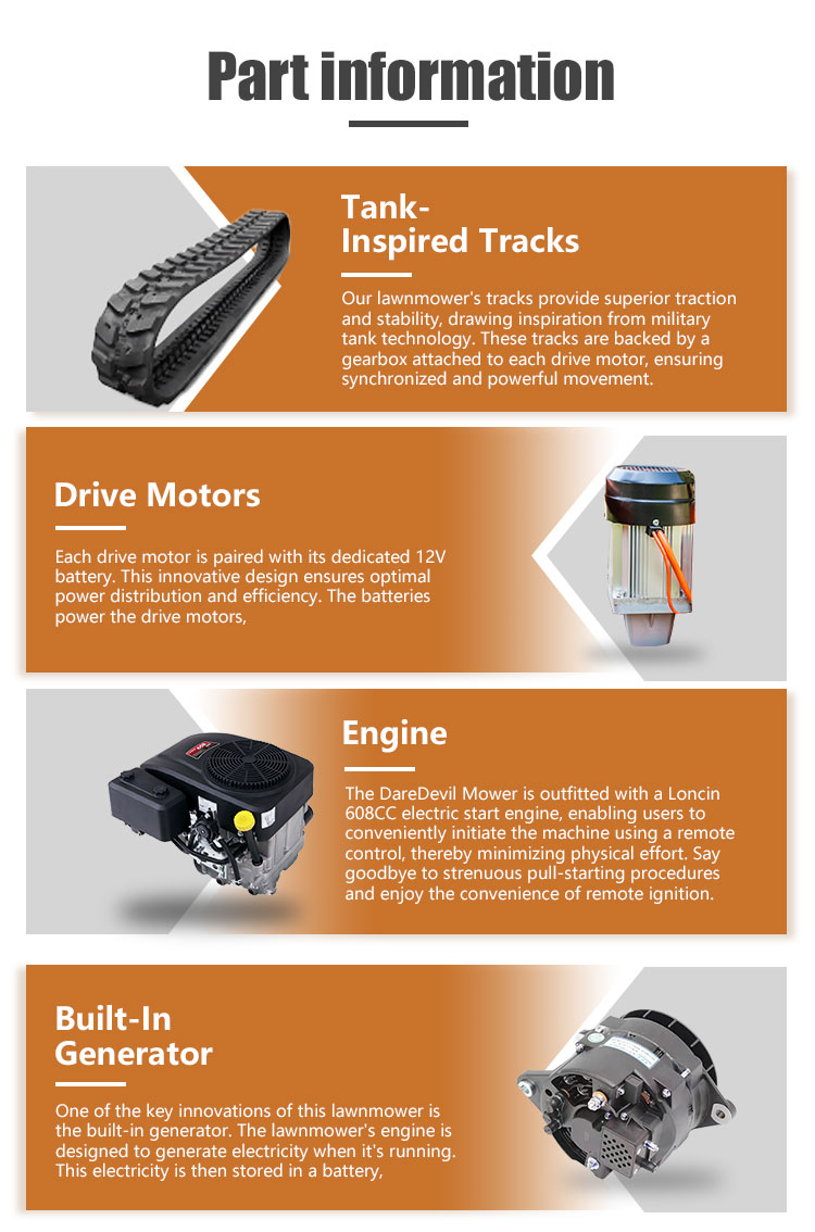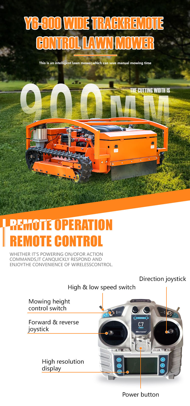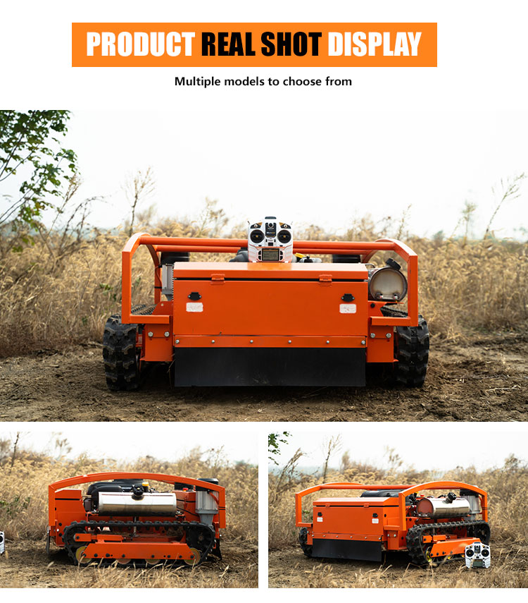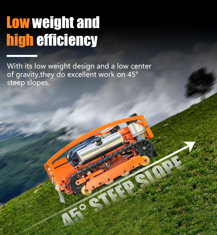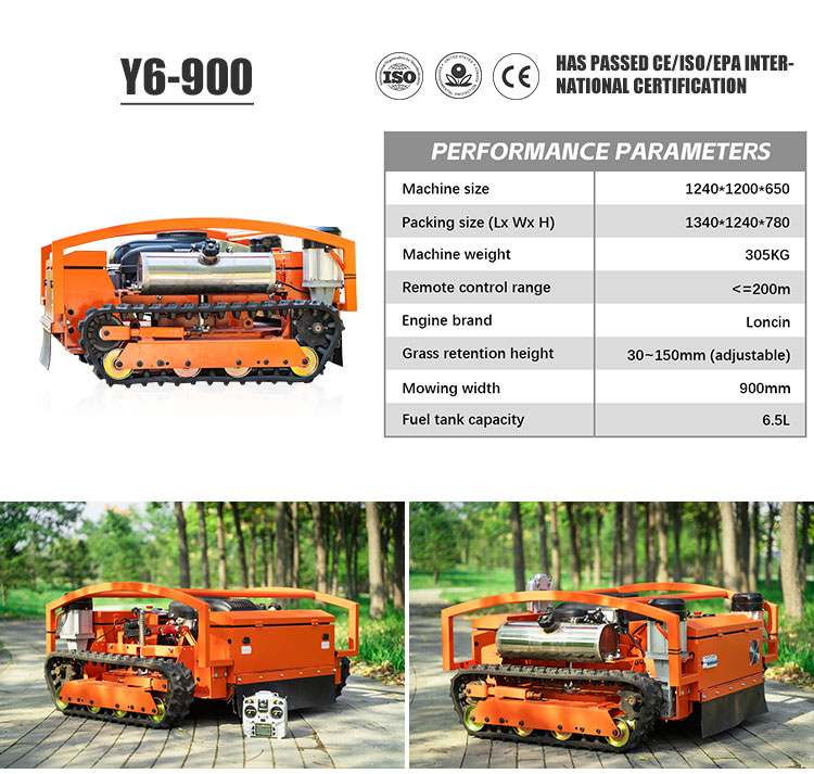 The Y6-900 Wide Track Remote Control Lawn Mower is a professional-grade machine designed for challenging terrains. Its 900mm cutting deck delivers 3000m²/hour efficiency, ideal for large areas. The 21HP engine provides robust power, while the wide-track design (1240×1200×1240mm, 303kg) ensures stability on slopes up to 55°.Operating at 4km/h, it balances speed and precision. The remote control system allows safe operation on steep embankments, dams, and difficult landscapes. Perfect for commercial and municipal use, this mower combines power, stability, and advanced control for demanding mowing tasks.